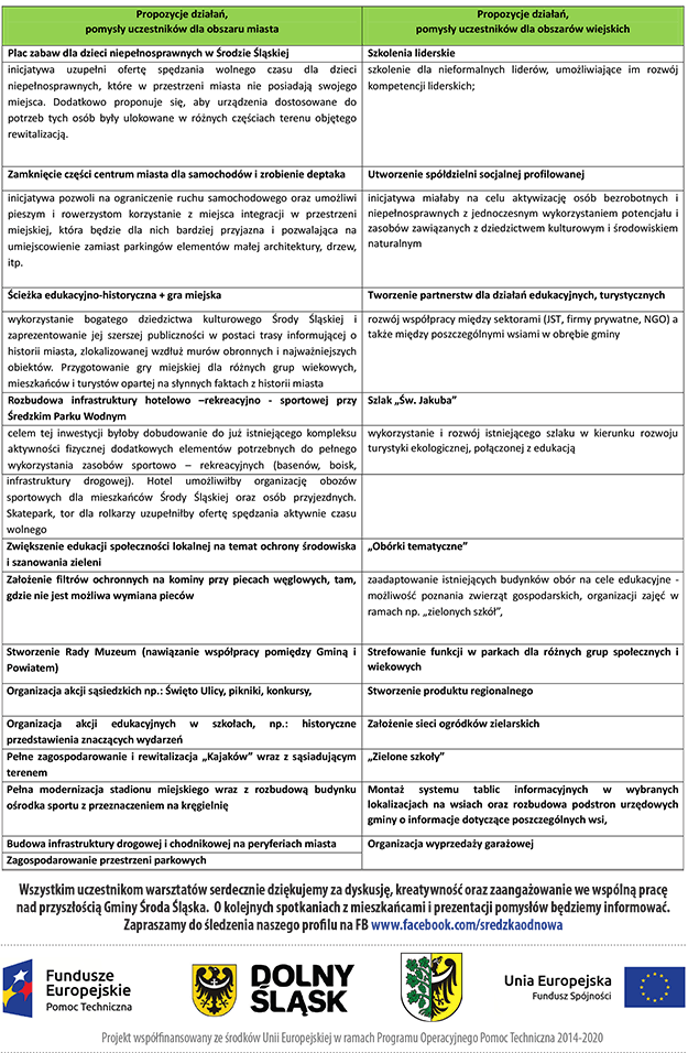 Rezultatem wspólnej warsztatowej pracy mieszkańców były propozycje działań i projektów, które mogą przyczynić się do zmiany niekorzystnej sytuacji na terenie gminy Środa Śląska, zarówno w mieście, jak i na obszarach wiejskich, które przedstawiono w poniższej tabeli.
