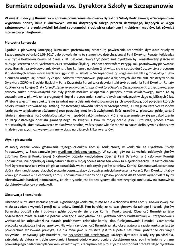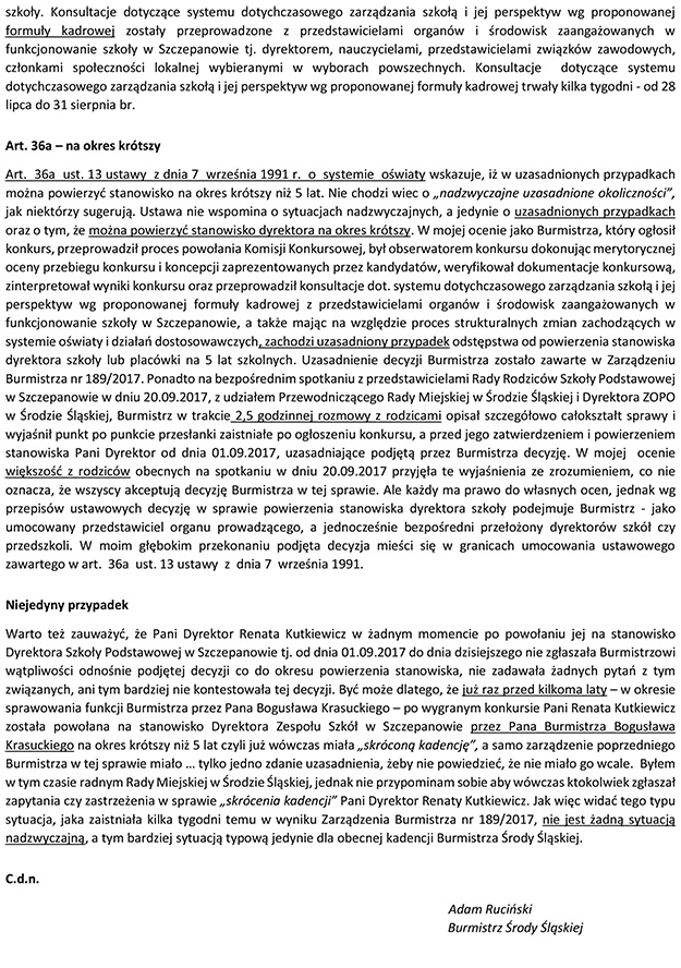 Poniżej pierwsza część odpowiedzi burmistrza Środy Śląskiej na pytania radnych dotyczące powołania na rok dyrektor szkoły w Szczepanowie.