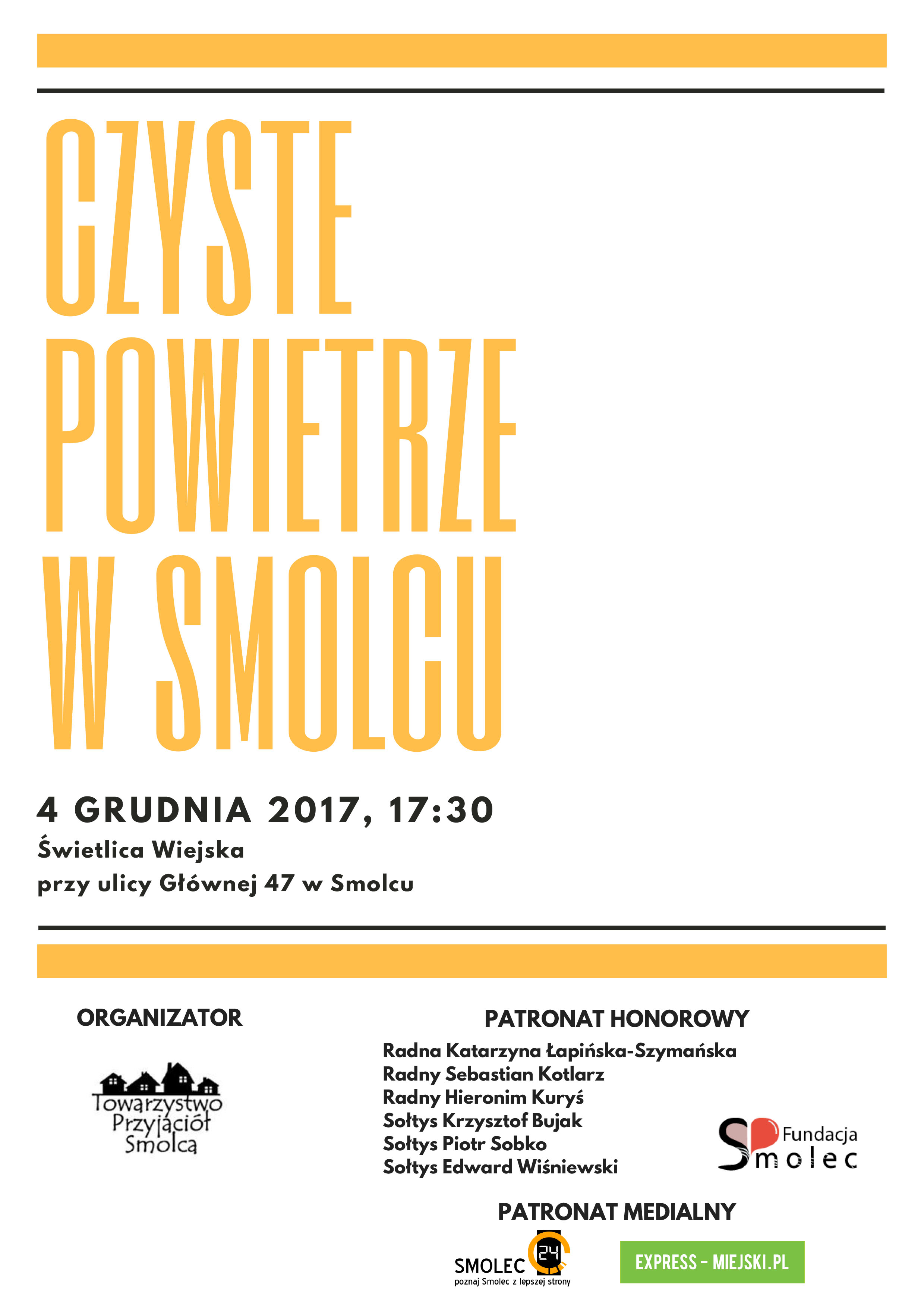 Skąd pomysł na akcję „Czyste powietrze w Smolcu i okolicy”? - Jestem biegaczką amatorką, od trzech lat aktywnie wspieram Smolecką Zadyszkę, od tego roku działam także w Towarzystwie Przyjaciół Smolca. Kiedy zbliża się sezon grzewczy obserwuję coraz większe zadymienie Smolca i okolicy. Niestety z roku na rok jest coraz gorzej. Któregoś popołudnia odwoziłam syna na trening na boisku w Smolcu, sama poszłam biegać i nagle okazało się, że nie mogę oddychać właśnie przez smog i zanieczyszczenie powietrza. W TPS rozmawialiśmy o tym, że problem smogu, właściwego palenia w piecach czy problemów ze zdrowiem dotyczy także Smolca i okolic. W poprzednich latach sołtysi i radni próbowali inicjować różne akcje. Postanowiłam wszystkich skrzyknąć i podjeść do tematu całościowo: od wyjaśnienia wpływu smogu na zdrowie, poprzez techniki właściwego palenia, aż do uzyskania dotacji na wymianę pieców włącznie. Mam nadzieję, że zaangażowałam wystarczająco dużo osób, żeby spotkanie się udało. Proszę trzymać kciuki - komentuje inicjator wydarzenia Kamila Bartosik.