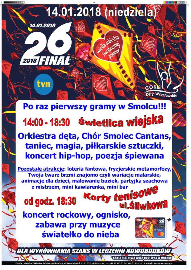 W tym roku Wielka Orkiestra Świątecznej Pomocy zadebiutuje w Smolcu. Od godziny 14 w świetlicy wiejskiej na mieszkańców czeka mnóstwo atrakcji. Ciekawie zapowiadają się fryzjerskie metamorfozy oraz wariacje malarskie pod tytułem „Twoja twarz brzmi znajomo”. Nie zabraknie również muzycznych akcentów. O 18:30 kluczowe elementy programu przeniosą się na korty tenisowe przy ulicy Śliwkowej, gdzie organizatorzy zapraszają na koncert rockowy, zabawę przy ognisku i tradycyjne „światełko do nieba”.