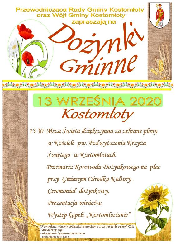 Gminne dożynki w Kostomłotach o godz. 13:30 rozpocznie msza święta dziękczynna za zebrane plony w kościele pw. Podwyższenia Krzyża Świętego. Po niej uczestnicy przejdą w korowodzie dożynkowym na plac przy Gminnym Ośrodku Kultury w Kostomłotach. Tam odbędzie się ceremoniał dożynkowy, prezentacja wieńców oraz występ kapeli Kostomłocianie.