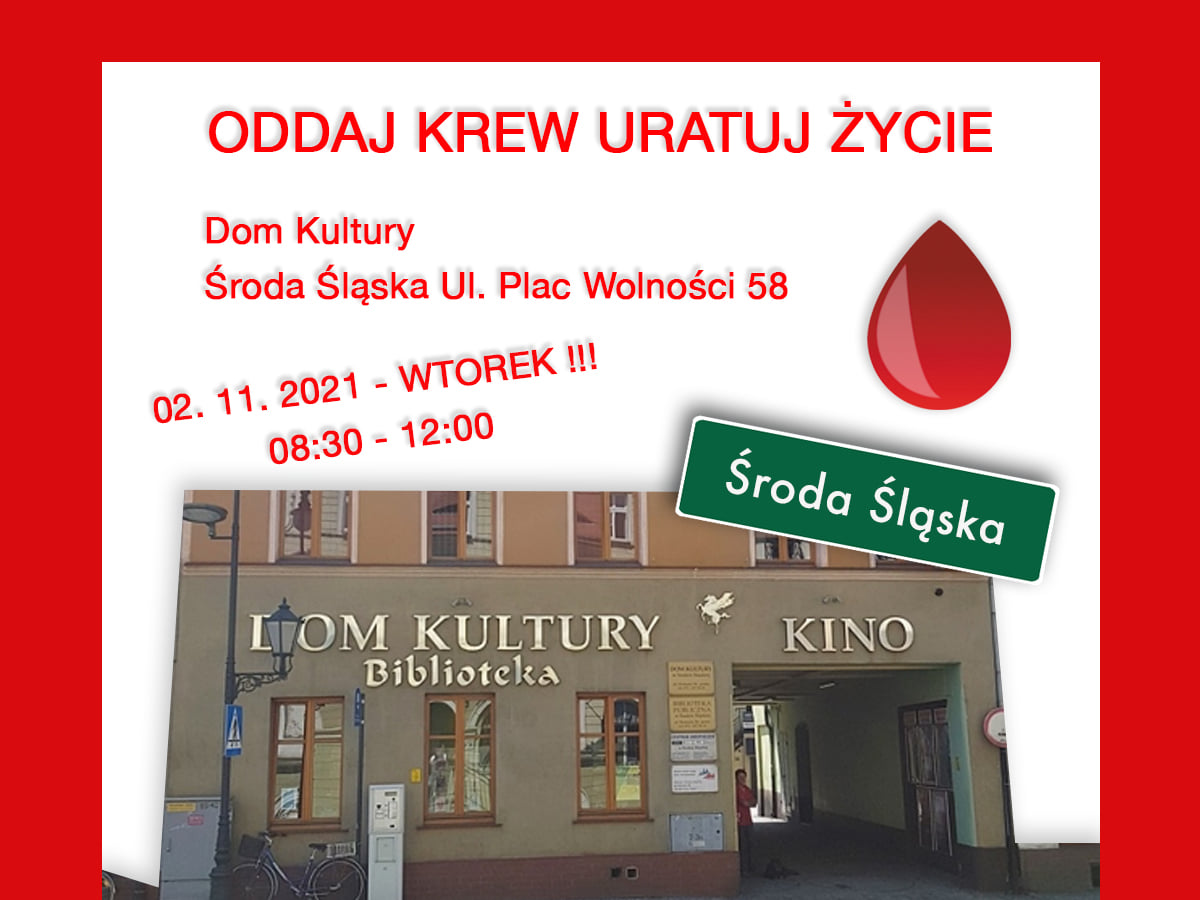 We wtorek 2 listopada w Domu Kultury przy Placu Wolności 58 w Środzie Śląskiej odbędzie się zbiórka krwi. Mieszkańcy, którzy chcą podzielić się tym życiodajnym płynem będą mogli to zrobić w godzinach od 8.30 do 12.00.