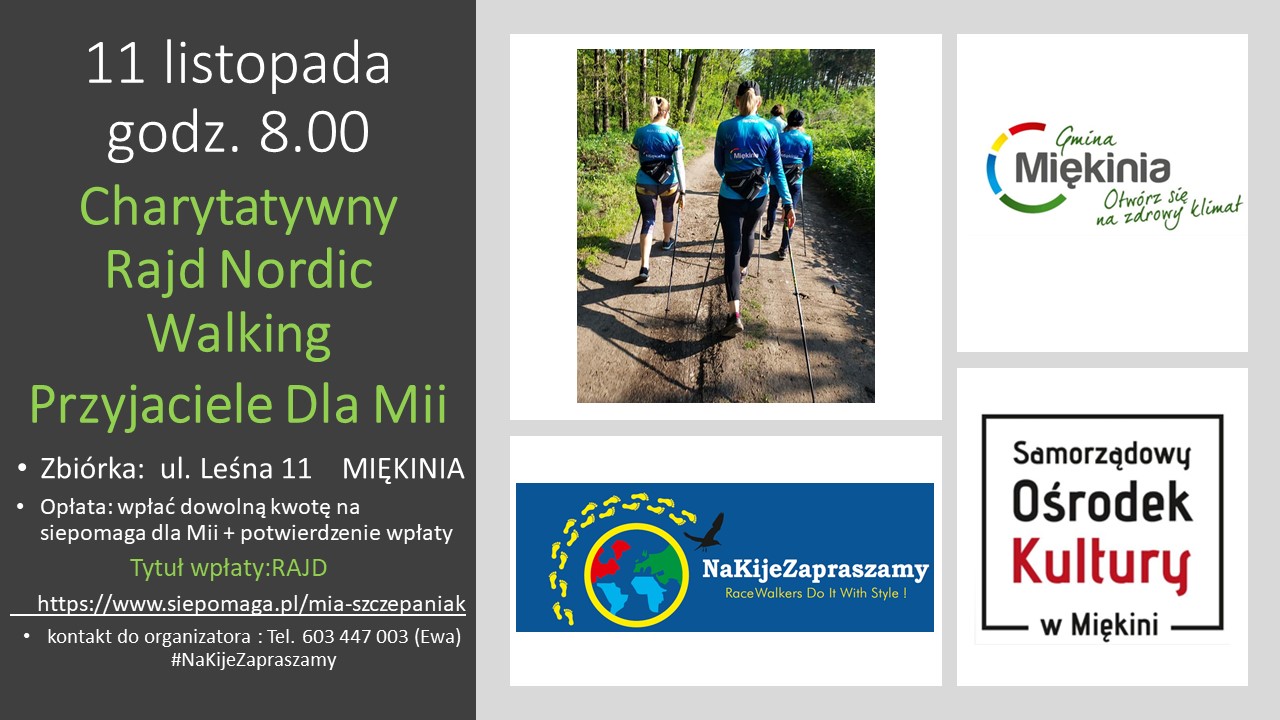 Charytatywny Rajd Nordic Walking "Przyjaciele Dla Mii" odbędzie się 11 listopada o godzinie 08:00. Zbiórka: ul. Leśna 11 w Miękini. Trasa liczyć będzie 11 kilometrów. Obowiązuja stroje sportowe.