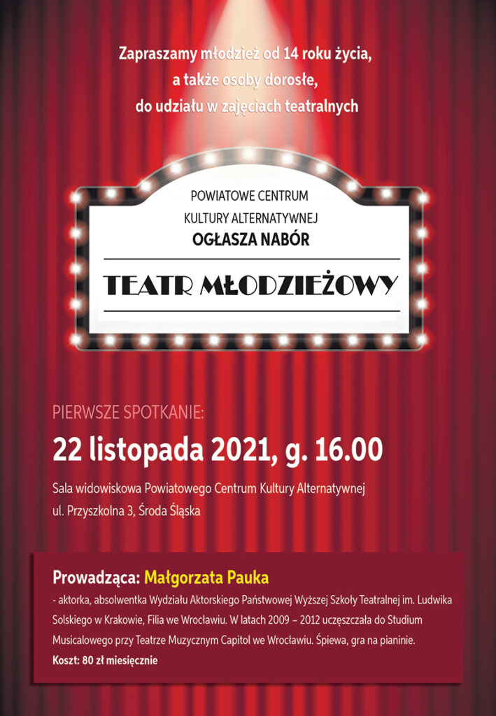 Rozpoczęły się zapisy do Młodzieżowego Teatru w Powiatowym Centrum Kultury Alternatywnej. Chętni zgłaszać mogą się w każdy poniedziałek w godzinach od 16 do 19.