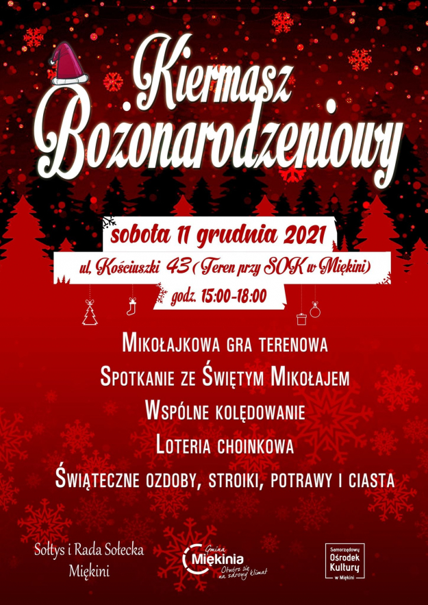W sobotę 11 grudnia na terenie przy Samorządowym Ośrodku Kultury w Miękini odbędzie się kiermasz bożonarodzeniowy.