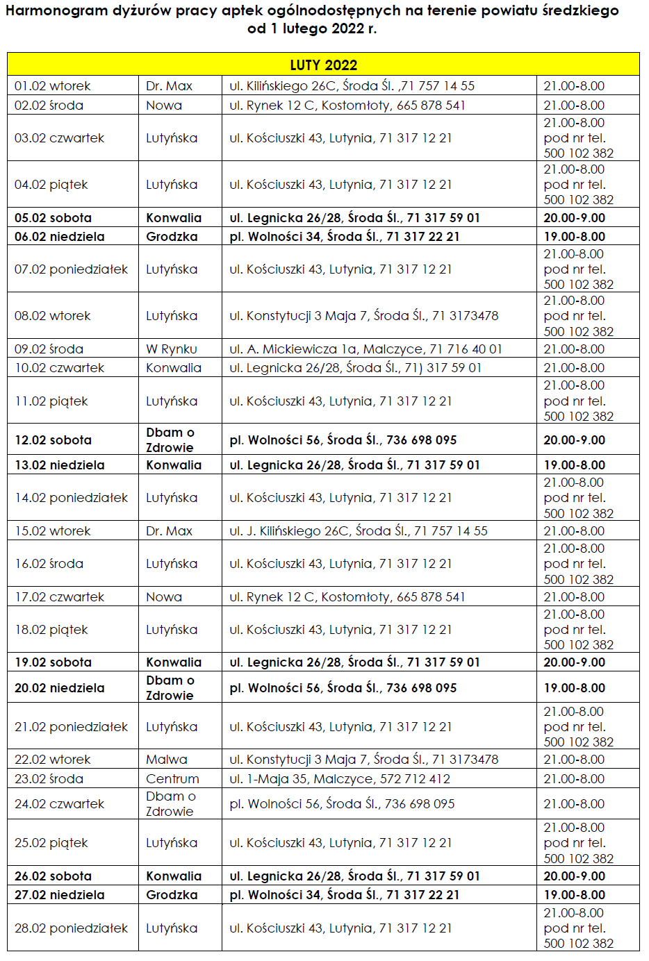 Publikujemy harmonogram dyżurów pracy aptek ogólnodostępnych na terenie powiatu średzkiego w lutym 2022 roku.