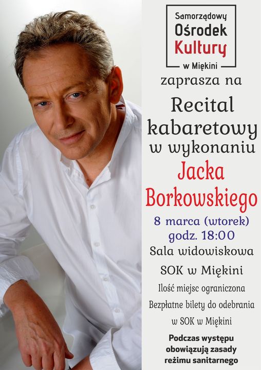 We wtorek 8 marca w Samorządowym Ośrodku Kultury w Miękini odbędzie się recital kabaretowy w wykonaniu Jacka Borowskiego.