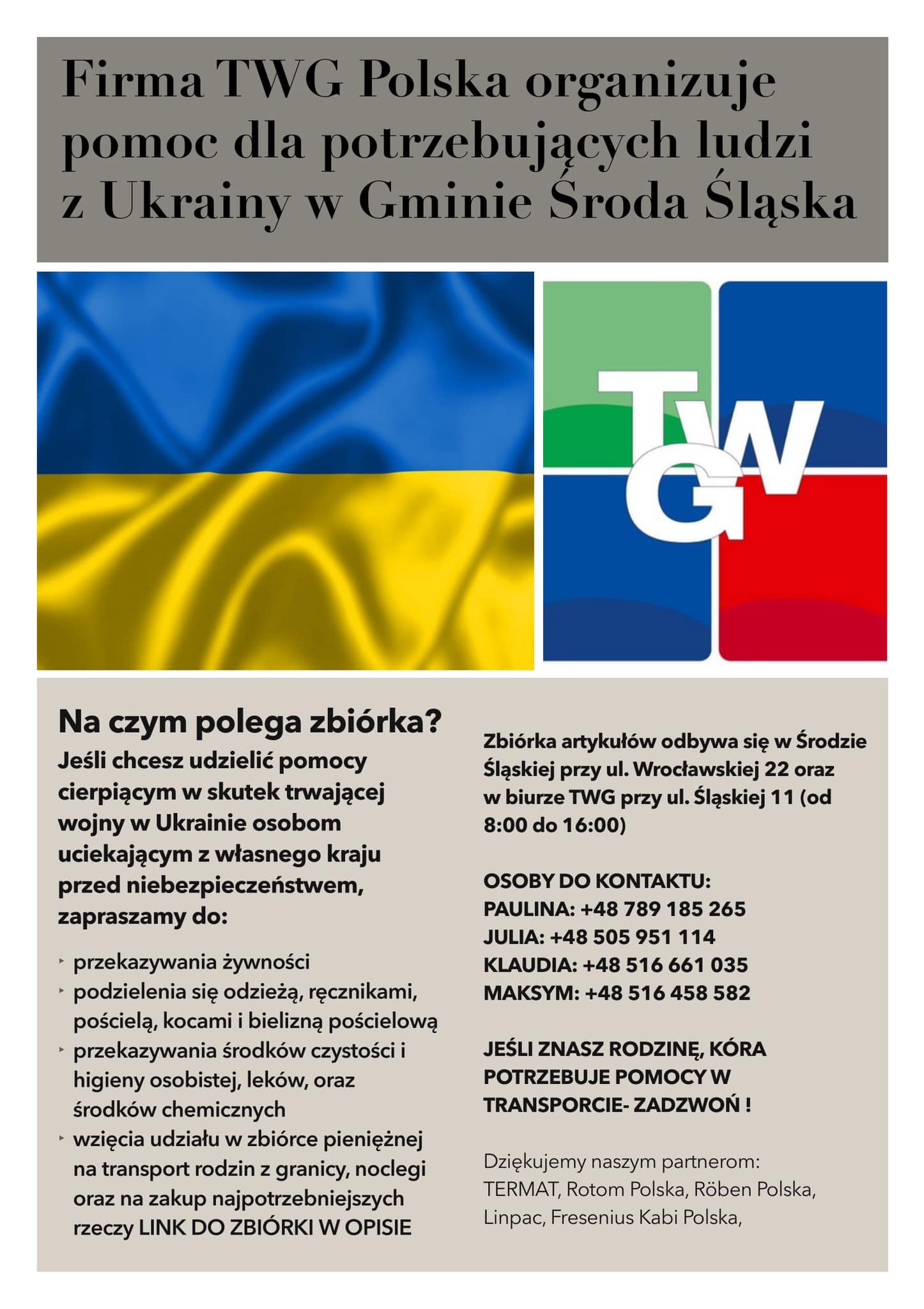 TWG Polska organizuje zbiórkę dla rodzin z Ukrainy w gminie Środa Śląska. - Najpotrzebniejsze rzeczy tj. odzież, żywność (makarony, mąki, konserwy, dżemy itp) środki higieny osobistej, prosimy o przekazywanie do naszego biura, które mieści się w Środzie Śląskiej przy ul. Śląskiej w godzinach 8-16 lub na ul. Wrocławską 22. Zbiórka organizowana jest również w miejscowości Szczepanów, Strzegom, Świdnica, Świebodzice,Wałbrzych. Nasz team jest w stanie odebrać rzeczy i przewieźć je do miejsca docelowego w Środzie Śląskiej - informują organizatorzy. Zorganizowano również zbiórkę środków, prowadzoną na portalu pomagam.pl.