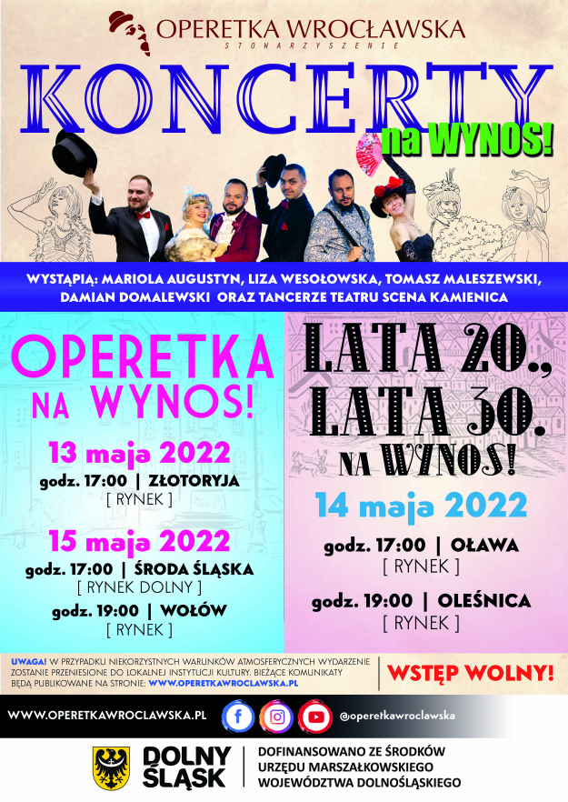Stowarzyszenie Operetka Wrocławska serdecznie zaprasza na pięć plenerowych koncertów, które odbędą się w miejscowościach Dolnego Śląska, w brawurowym wykonaniu znakomitych śpiewaków oraz tancerzy Teatru Scena Kamienica.