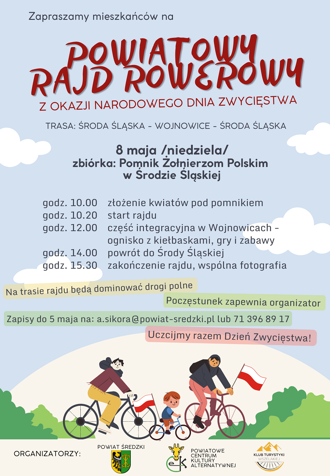 Osoby zainteresowane rajdem rowerowym proszone są o zgłaszanie udziału (liczba uczestników, imię i nazwisko oraz tel. osoby zgłaszającej!) na adres: a.sikora@powiat-sredzki.pl. Zgłoszenia przyjmowane będą do czwartku 5 maja.
