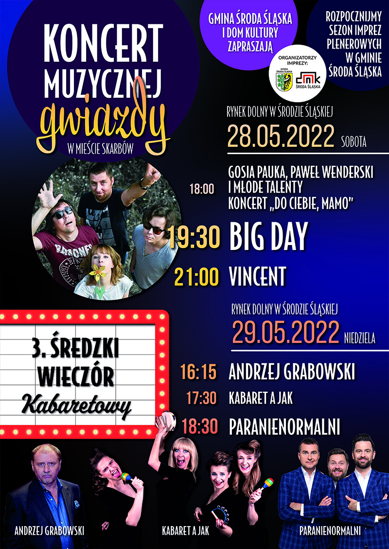 W sobotę na średzkiej scenie wystąpią Gosia Pauka i Paweł Wenderski wraz z młodymi talentami oraz zespoły Big Day i Vincent. W niedzielę w ramach 3. Średzkiego Wieczoru Kabaretowego średzką publiczność bawić będą Andrzej Grabowski, Kabaret A Jak i Paranienormalni.