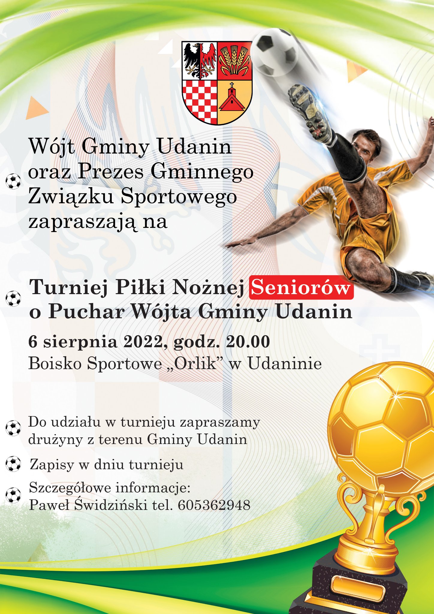 Wójt Gminy Udanin Wojciech Płaziuk oraz Prezes Gminnego Związku Sportowego Udanin - Paweł Świdziński zapraszają drużyny piłkarskie z terenu gminy do udziału w turnieju piłki nożnej seniorów.