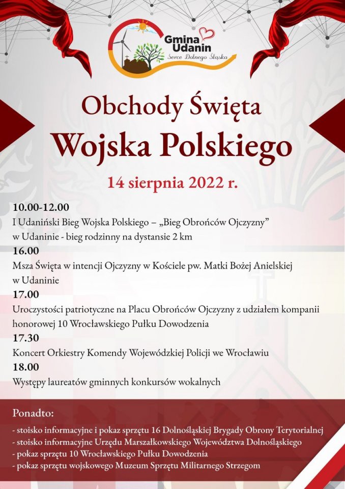 Obchody Święta Wojska Polskiego w Udaninie nie ograniczają się jedynie do biegu. O 16.00 w kościele pw. Matki Bożej Anielskiej odprawiona zostanie msza święta w intencji Ojczyzny. Godzinę później na Placu Obrońców Ojczyzny odbędą się uroczystości patriotyczne z udziałem kompanii honorowej 10. Wrocławskiego Pułku Dowodzenia. Muzycznym zwieńczeniem obchodów będzie koncert Orkiestry Komendy Wojewódzkiej Policji we Wrocławiu oraz laureatów gminnych konkursów wokalnych.