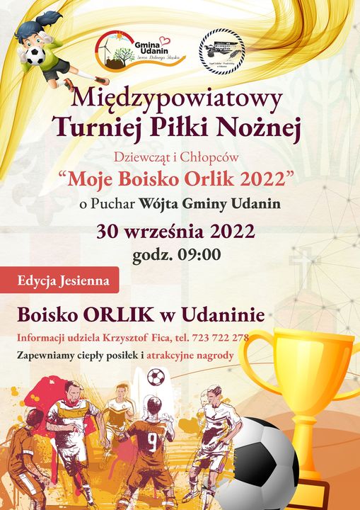 Wójt Gminy Udanin Wojciech Płaziuk zaprasza na Międzypowiatowy Turniej Piłki Nożnej Dziewcząt i Chłopców "Moje boisko ORLIK" o puchar wójta, który odbędzie się 30 września 2022 r. w Udaninie.