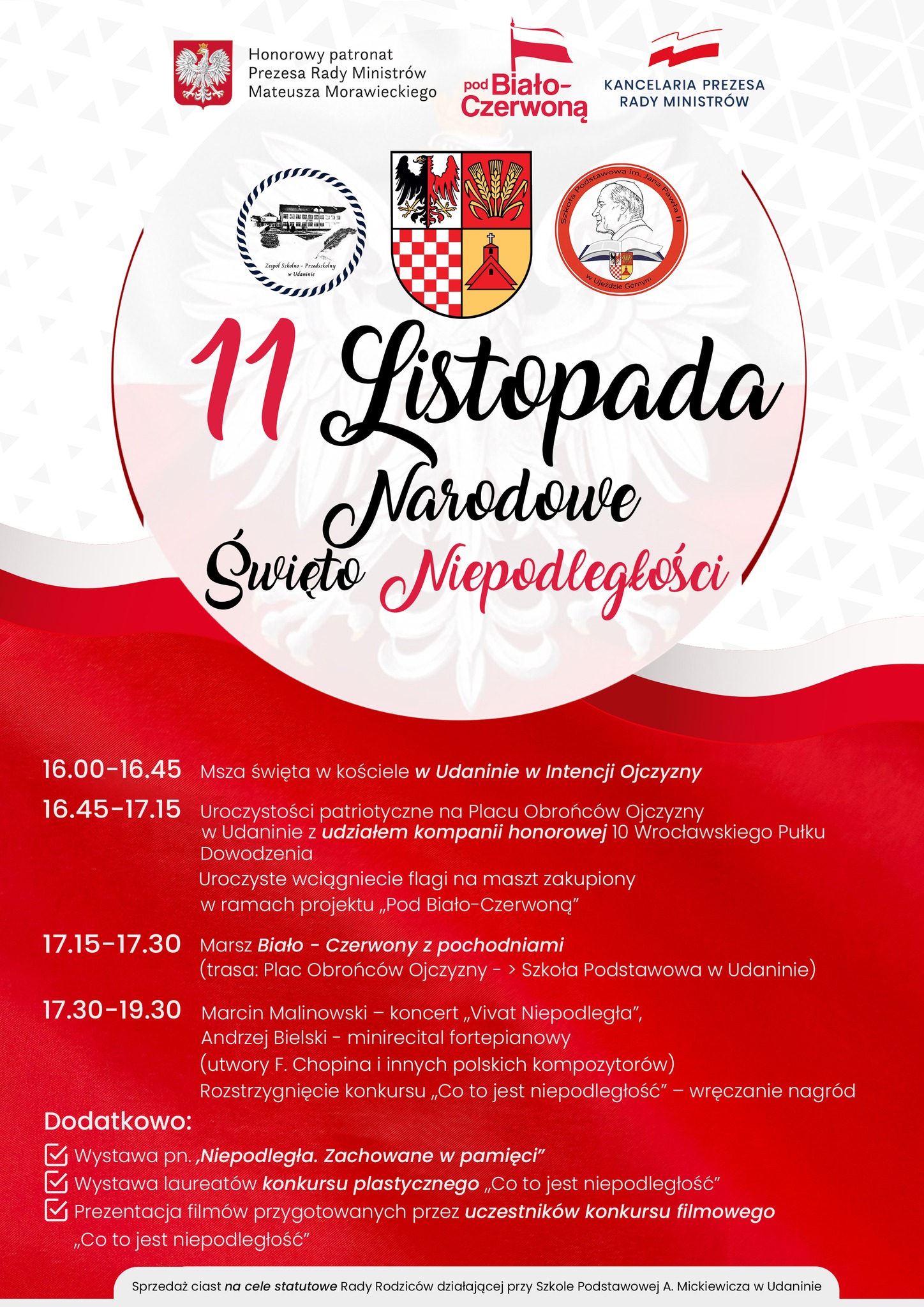 Rocznica odzyskania przez Polskę niepodległości upamiętniona zostanie mszą świętą w kościele pw. Matki Bożej Anielskiej w Udaninie. Początek o godzinie 16.00. Niecałą godzinę później obchody przeniosą się na Plac Obrońców Ojczyzny, gdzie uroczystości odbędą się z udziałem kompanii honorowej 10. Wrocławskiego Pułku Dowodzenia.