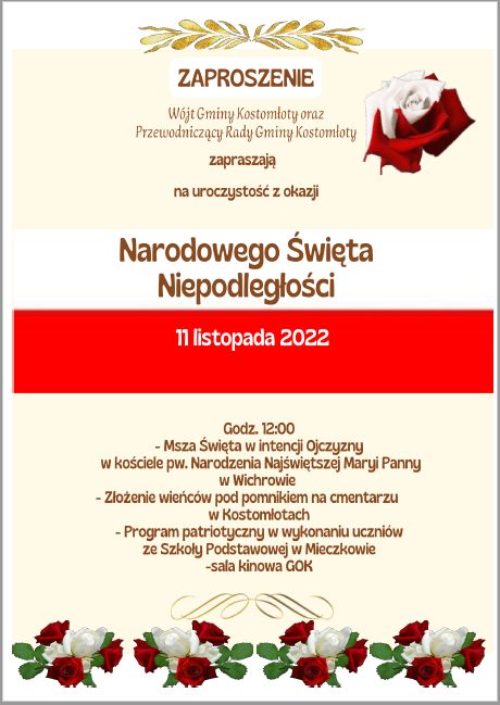 W sobotę 11 listopada świętować będzie gmina Kostomłoty. Obchody rozpoczynają się mszą świętą w kościele pw. Narodzenia Najświętszej Maryi Panny w Wichrowie. Następnie delegacje wieńcowe złożą kwiaty pod pomnikiem na cmentarzu w Kostomłotach, by udać się do sali kinowej Gminnego Ośrodka Kultury, gdzie zaplanowano program patriotyczny w wykonaniu uczniów szkoły podstawowej w Mieczkowie.