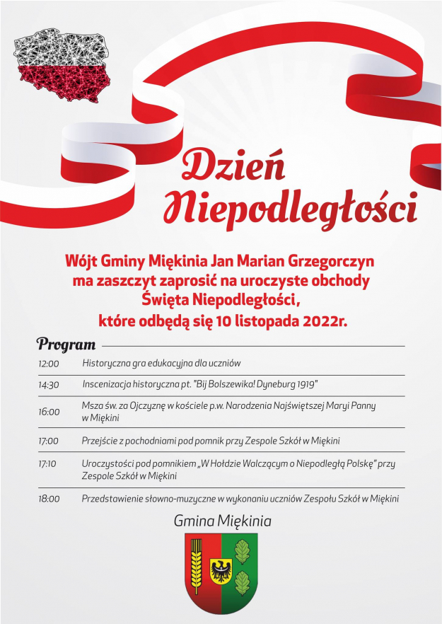 Już 10 listopada uroczyste obchody odbędą się w Miękini, gdzie wydarzenie rozpocznie się o godzinie 12.00 historyczną grą edukacyjną dla uczniów. Na 14.30 zaplanowano inscenizację historyczną pt. "Bij Bolszewika! Dyneburg 1919". Po mszy świętej tradycyjny pochód z pochodniami przejdzie pod pomnik "W Hołdzie Walczącym o Niepodległą Polską" przy Zespole Szkół w Miękini, gdzie kontynuowane będą dalsze uroczystości.
