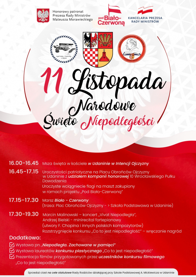Msza w intencji ojczyzny rozpocznie obchodzy w Udaninie. 11 listopada o godzinie 16.45 uroczystości przeniosą się na Plac Obrońców Ojczyzny. Biało-czerwony marsz poprowadzi zebranych do szkoły podstawowej, gdzie wystapią Marcin Malinowski i Andrzej Bielski. Rozstrzygnięty zostanie również konkurs "Co to jest niepodległość".