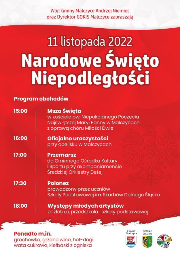 Dzień Niepodległości 11 listopada obchodzony będzie również w Malczycach. Po tradycyjnej mszy świętej oficjalne uroczystości przeprowadzone zostaną przy malczyckim obelisku. Następnie zabrani przemaszerują do Gminnego Ośrodka Kultury i Sportu przy akompaniamencie Średzkiej Orkiestry Dętej, gdzie z inicjatywy uczniów szkoły podstawowej odtańczony zostanie polonez. Następnie zaplanowano występy młodych artystów.