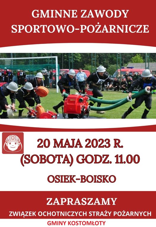 Serdecznie zapraszamy w imieniu Ochotniczych Straży Pożarnych Gminy Kostomłoty do kibicowania drużynom dziecięcym, młodzieżowym i seniorskim w Gminnych Zawodach Sportowo Pożarniczych w Osieku (boisko sportowe) w najbliższą sobotę.
