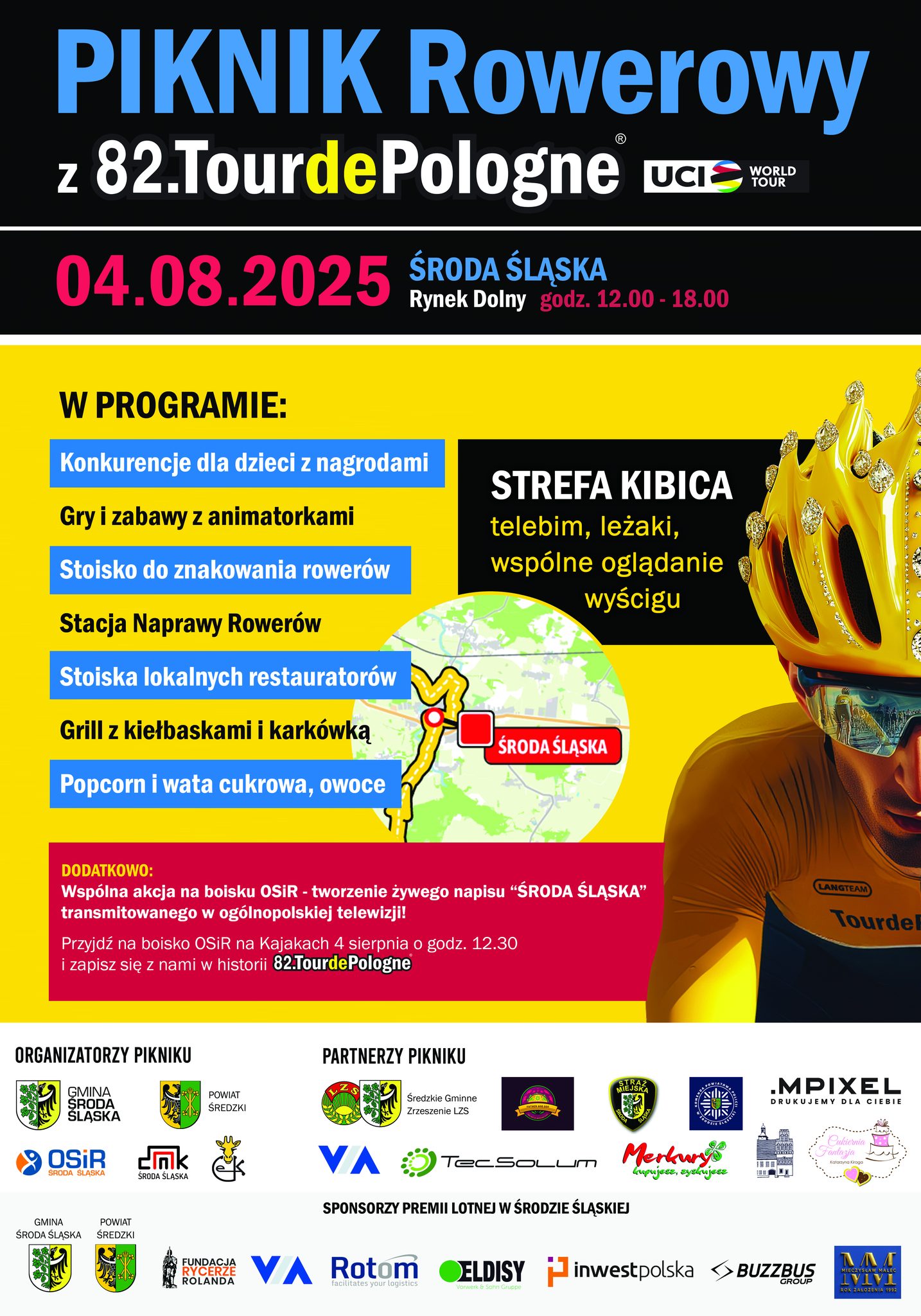 To będzie dzień pełen emocji, atrakcji i wspólnego kibicowania – zarówno dla dzieci, jak i dorosłych. Główna część wydarzenia odbędzie się na rynku dolnym, gdzie zorganizowany zostanie Piknik Rowerowy, pełen sportowych i kulinarnych atrakcji.