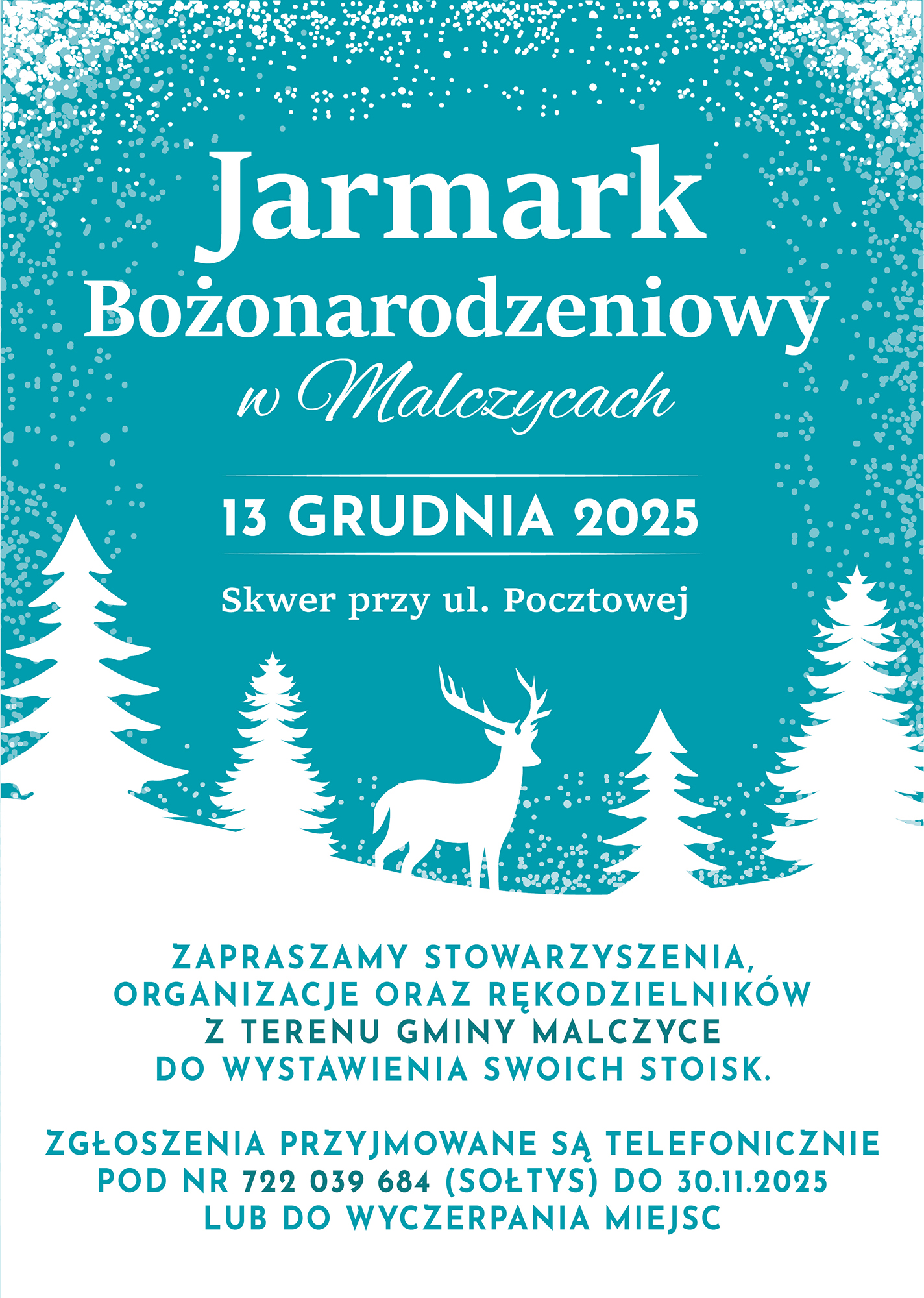 Sołectwo Malczyce ogłosiło rozpoczęcie zapisów na stoiska podczas tegorocznego Jarmarku Bożonarodzeniowego, który odbędzie się 13 grudnia tradycyjnie na skwerze przy ul. Pocztowej.