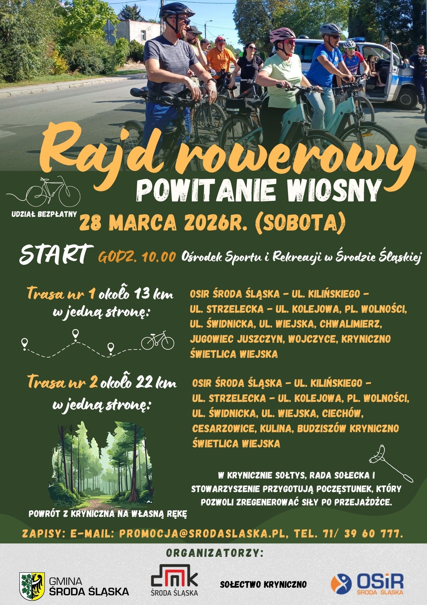 Wydarzenie to propozycja dla mieszkańców powiatu średzkiego, którzy chcą aktywnie rozpocząć wiosnę, spędzić czas na świeżym powietrzu i wspólnie odkrywać urokliwe zakątki okolicy. Organizatorzy zachęcają do zapisów i przygotowania rowerów na pierwszy wiosenny przejazd.