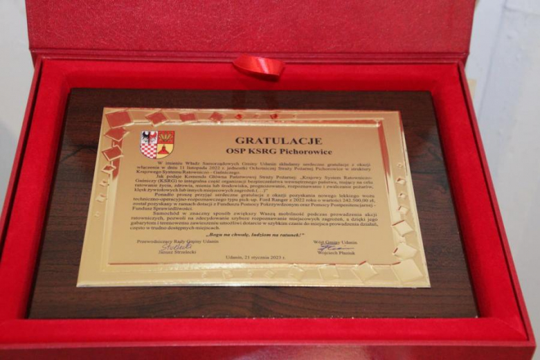 W dniu 21 stycznia 2023 r. odbyła się uroczystość oficjalnego przekazania samochodu oraz przyjęcie OSP Pichorowice w struktury KSRG. Po powitaniu gości nastąpiło uroczyste przekazanie nowego samochodu techniczno-operacyjno-rozpoznawczego typu pick-up uprzednio poświęconego przez miejscowego księdza proboszcza Mariusza Sajdaka. Symbolicznego przekazania lekkiego wozu dokonali Poseł do Parlamentu Europejskiego Beata Kempa, Poseł na Sejm RP Paweł Hreniak oraz Wójt Gminy Udanin Wojciech Płaziuk. Samochód został pozyskany w ramach dotacji z Funduszu Pomocy Pokrzywdzonym oraz Pomocy Postpenitencjarnej – Fundusz Sprawiedliwości.