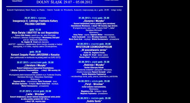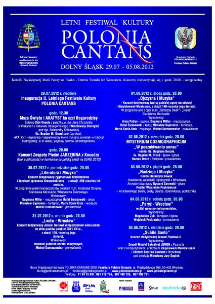 Tegoroczny festiwal Polonia Cantans zbiega się z 200. rocznicą urodzin Zygmunta Krasińskiego i Józefa Ignacego Kraszewskiego oraz 140. rocznicą śmierci Stanisława Moniuszki. W związku z tym odbędą się koncerty dedykowane, dwóm pierwszym twórcom w poniedziałek, 29 lipca, a autorowi oper „Halka” i „Straszny Dwór” w środę.