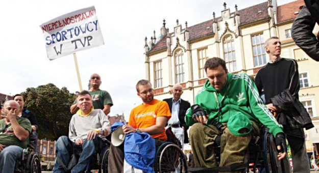 Kilkadziesiąt osób protestowało w Rynku przeciw zbyt krótkim relacjom TVP z paraolimpiady sportowców niepełnosprawnych w Londynie.