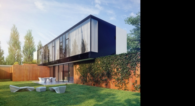 Prosta, modernistyczna bryła przyciąga wzrok dzięki ciekawym wykończeniom. Dolne partie zostały pokryte okładziną z blachy korteńskiej, która z biegiem czasu ulega kontrolowanej korozji, zmienia swój odcień na rdzawy i nabiera chropowatej faktury. Ściany zamiast standardowego „baranka” pokryje bardzo gładki, biały tynk.