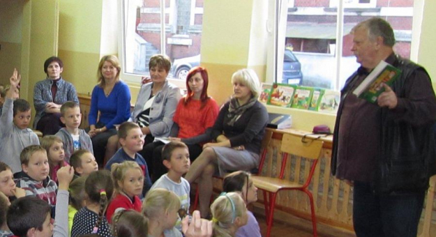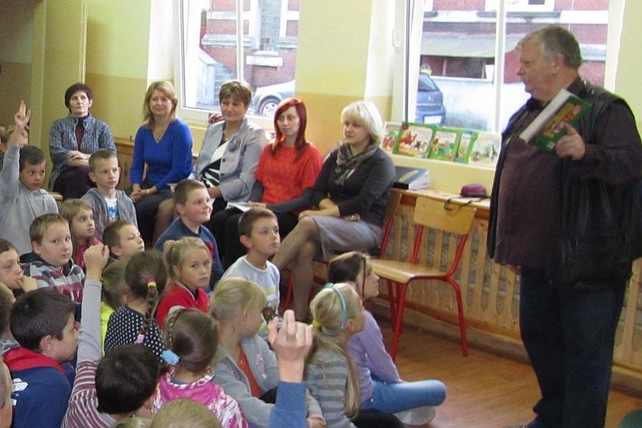 Na spotkanie zaproszono uczniów i grono pedagogiczne. Dzieci dowiedziały się jak powstaje książka, począwszy od pomysłu aż do jej wydrukowania. W sali gimnastycznej autor czytał na głos swoje dzieła – zagadki.
