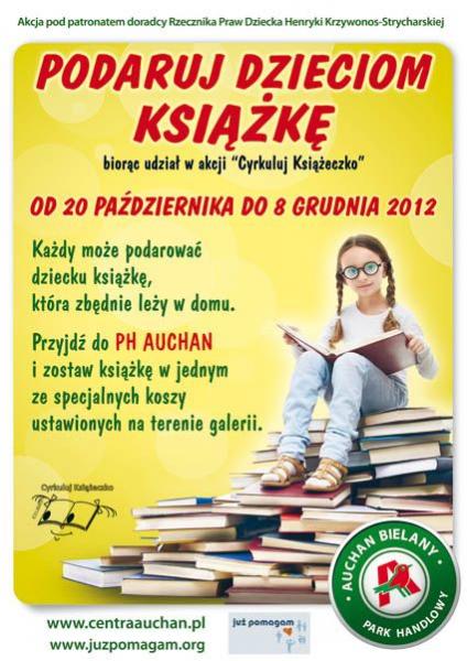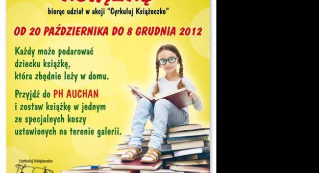 Akcja „Cyrkuluj książeczko” trwa od 20 października do 8 grudnia. Przez siedem tygodni w CH Auchan w Bydgoszczy, Rumi, Gdańsku, Białymstoku, Bielanach Wrocławskich, Swadzimiu i Sosnowcu będą stały specjalne pojemniki, do których można wrzucać książki dla dzieci.
