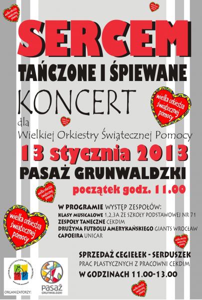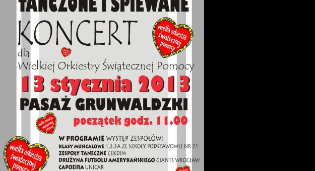 Pasaż Grunwaldzki po raz kolejny przyłączy się do kwestowania dla Wielkiej Orkiestry Świątecznej Pomocy. Klienci Centrum wesprą tegoroczną zbiórkę na rzecz ratowania życia dzieci i godnej opieki medycznej seniorów. O godzinie 11.00 na scenie Pasażu rozpocznie się specjalny koncert „Sercem tańczone i śpiewane dla WOŚP” przygotowany przez wrocławskie Centrum Edukacji Kulturalnej Dzieci i Młodzieży. Zaplanowano występy muzyczne dzieci z klas musicalowych oraz liczne pokazy taneczne. Najmłodsi zaprezentują m.in. taniec nowoczesny, street jazz i hip-hop. Dla WOŚP wystąpi również drużyna futbolu amerykańskiego Giants Wrocław oraz grupa Capoeira Unicar.
