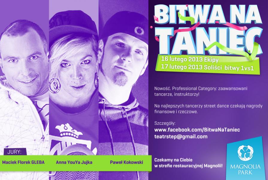 Wyjątkowe emocje czekają klientów Magnolii również w weekend. W Bitwie na Taniec zmierzą się tancerze amatorzy hip-hop i freestyle oraz zespoły street dance w różnych kategoriach wiekowych. Występy będzie oceniać jury, w skład którego wejdzie Maciej Florek „Gleba”, zwycięzca pierwszej edycji programu „You Can Dance”, oraz doświadczeni tancerze Anna „YouYa” Jujka i Paweł Kokowski „Buli”. Zarówno soliści, jak i zespoły, zawalczą o Puchar Magnolii w postaci nagrody pieniężnej. W przerwach pokazów konkursowych odbędą się bezpłatne warsztaty i pokazy taneczne Teatru Tańca Step oraz członków jury.