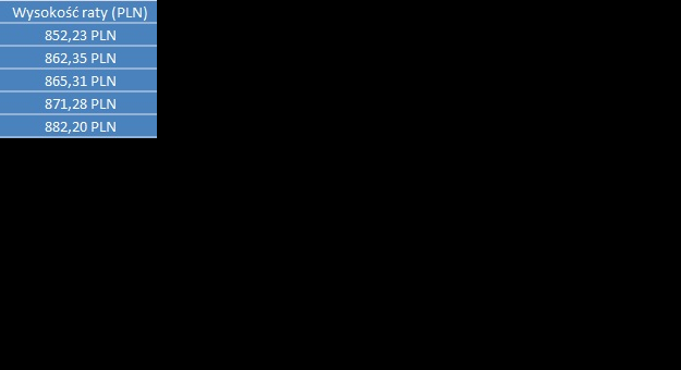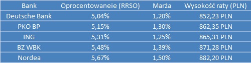 Dla przykładu, atrakcyjna dla studenta kawalerka zlokalizowana we Wrocławiu przy Rondzie Powstańców Śląskich o powierzchni 35 m kw. kosztuje 200 tys. zł. Portal Sfera-Finansów.pl przygotował zestawienie ofert 5 banków na zakup tej nieruchomości, przy założeniu, że osoba zainteresowana dysponuje wkładem własnym w wysokości 20 proc. wartości nieruchomości, co daje kwotę kredytu w wysokości 160 tys zł., a kredyt został wzięty na 30 lat (założono stałe raty wyliczone dla osoby z dochodami na poziomie 5 tys. zł netto).