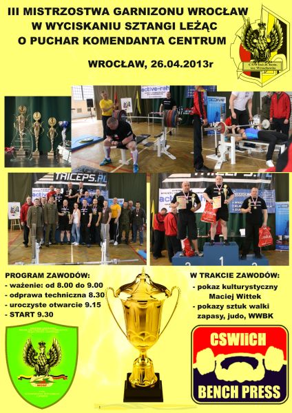 26. kwietnia na terenie wrocławskiego Centrum Szkolenia odbędzie się III Puchar Komendanta Centrum w ramach Mistrzostw Garnizonu Wrocław w Wyciskaniu Sztangi Leżąc.