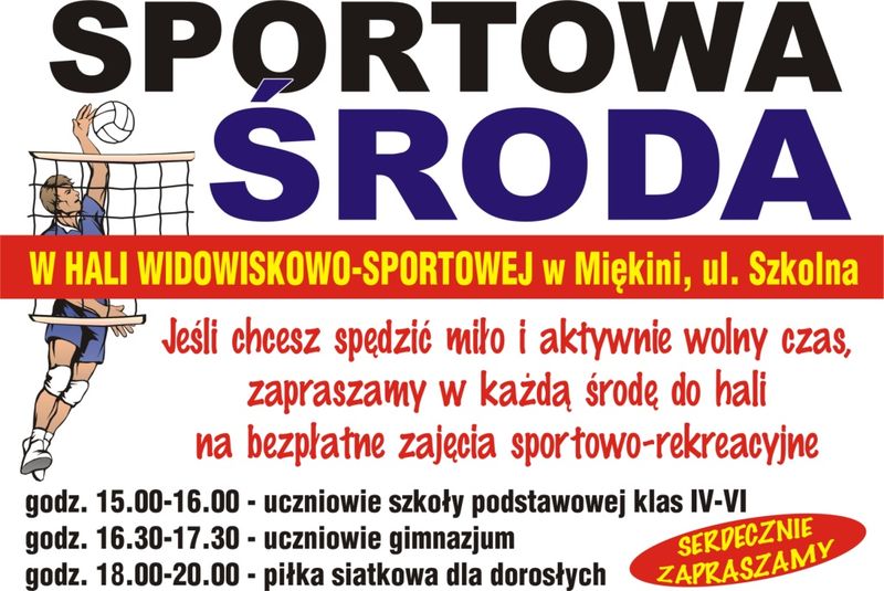 W hali widowiskowo-sportowej w Miękini w każdą środę odbywają się bezpłatne zajęcia sportowo - rekreacyjne.