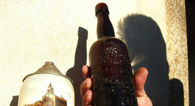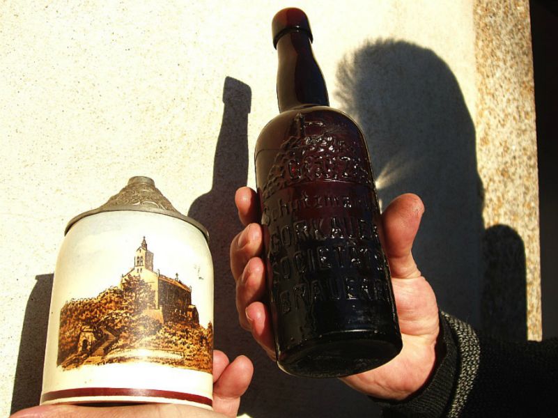 Przedwojenny kufel z wizerunkiem kościoła na Ślęży i butelka po piwie Gorkauer, które przed wojną warzono w Sobótce Górce znaleźli studenci archeologii.