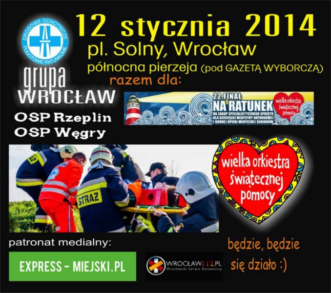 Akcję DOPR Wrocław i strażaków z OSP Węgry i OSP Rzeplin objęliśmy swoim patronatem. Będziemy na bieżąco informować Czytelników o planach ratowników i postępie przygotowań. Bądźcie z nami na Placu Solnym 12 stycznia 2014 roku podczas 22. Finału Wielkiej Orkiestry Świątecznej Pomocy!