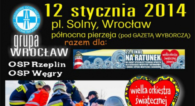 Na ratunek. Na zakup specjalistycznego sprzętu dla dziecięcej medycyny ratunkowej i godnej opieki medycznej seniorów - tak brzmi hasło kolejnej już edycji WOŚP prowadzonej przez Jurka Owsiaka. Tym razem w akcję angażują się także członkowie Ochotniczego Drogowego Pogotowia Ratunkowego we Wrocławiu i strażacy z Ochotniczej Straży Pożarnej: Rzeplin i Węgry.