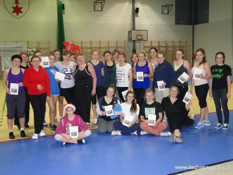 Spotkanie odbyło się w sobotę, 7 grudnia o godz. 19. Zajęcia poprowadziły instruktorki Gminnego Ośrodka Sportu i Rekreacji w Siechnicach - Marta Jędrzejowska instruktorka Zumby i Katarzyna Haśkiewicz główna instruktorka aerobiku.