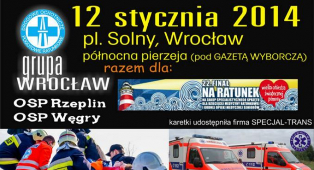 Już za dwa dni, w niedzielę 12 stycznia, ratownicy DOPR Wrocław i strażacy z Ochotniczej Straży Pożarnej Rzeplin i Węgry wezmą udział w 22. Finale WOŚP organizowanym na rynku we Wrocławiu. Ochotnicy pokażą, jak ratować ludzkie życie. – Sztab WOŚP wyznaczył nam miejsce w północnej pierzei placu Solnego. Właśnie tam damy fantastyczny pokaz uwalniania z wraku pojazdu osób poszkodowanych w wypadku samochodowym – zapowiada dowódca wrocławskiej grupy DOPR. Strażacy przekażą poszkodowanych w ręce lekarzy, którzy zaprezentują dalszy ciąg procedur medycznych. Organizatorzy specjalnie na potrzeby imprezy postarali się o karetkę pogotowia. – W akcie desperacji, by zaplanowany pokaz był idealny - szykowałem ostatnie gotówkowe zapasy na wynajem karetki. Niepotrzebnie, bo dzięki uprzejmości firmy Specjal-Trans s.c. Transport medyczny w Polsce i Europie mamy ją gratis – cieszy się ratownik.