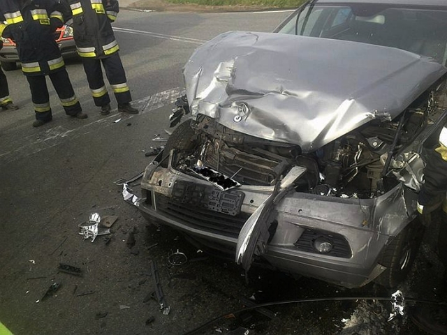 Listopad 2013. W pobliżu Jordanowa ciężarówka uderzyła w peugota. Kobieta prowadząca samochód osobowy skarżyła się na bóle kręgosłupa. Ranną pogotowie przewiozło do szpitala fot.: OSP Jordanów Śląski