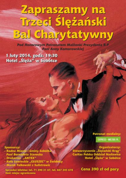 Stowarzyszenie Ślężański Krąg 1 lutego organizuje w Sobótce III Ślężański Bal Charytatywny. Datki zebrane podczas imprezy zostaną przekazane na całoroczną rehabilitację Adriana i Kacpra, dzieci z terenu gminy Sobótka, cierpiących na porażenie mózgowe oraz na remont zabytkowego kościółka w Księginicach Małych. Podczas I i II edycji Balu Charytatywnego stowarzyszenie zebrało aż 68 tysięcy złotych. W obu zabawach tanecznych uczestniczyło łącznie ponad 200 osób. Tym razem warunki lokalu pozwalają na zaproszenie 90 osób.