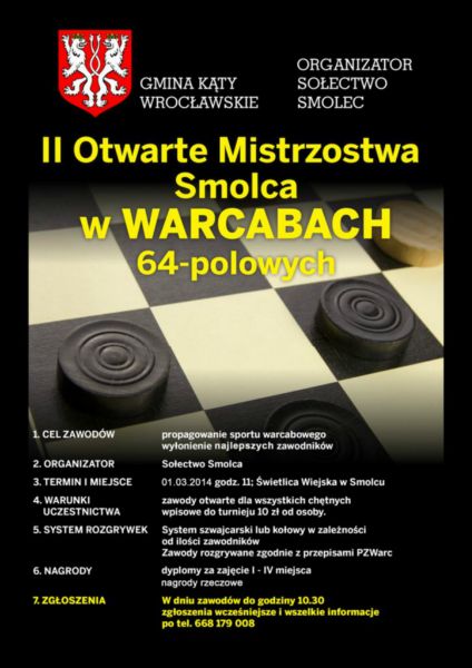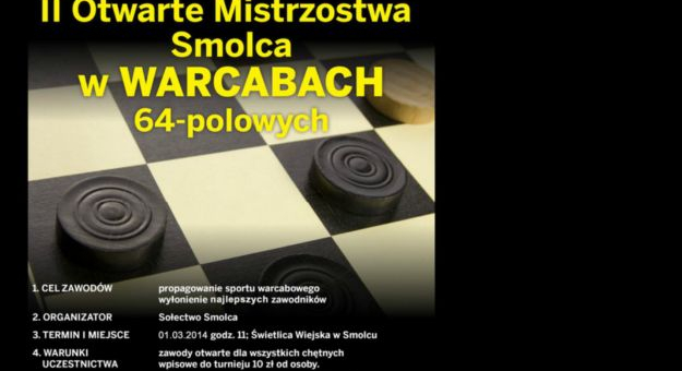 Mistrzostwa w warcabach odbędą się 1 marca o godz. 11 w świetlicy wiejskiej w Smolcu, przy ul. Głównej 47. – Pula nagród wynosi 2000 złotych – informuje Hieronim Kuryś, sołtys Smolca i zaprasza do wzięcia udziału w turnieju. Dodaje, że za zajęcie od I do IV miejsca przewidziane są dyplomy, nie zabraknie też nagród rzeczowych.