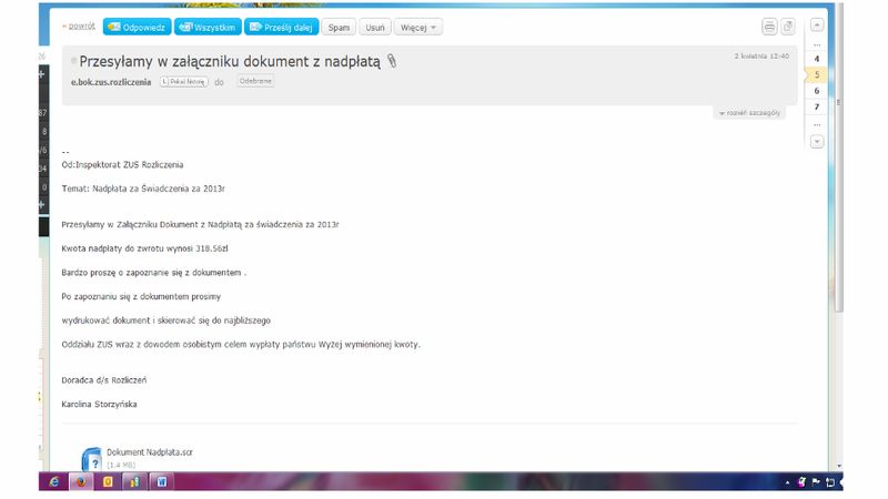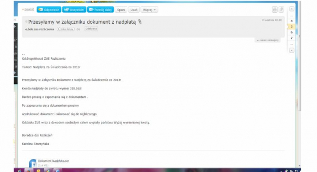 E-maile dotyczą rozliczeń świadczeń i zawierają informacje o rzekomej nadpłacie za świadczenie za 2013 rok. - Nie jesteśmy nadawcą tych e-maili. Zakład nie rozsyła pocztą elektroniczną informacji dotyczących rozliczeń świadczeń - informują rzecznicy prasowi oddziałów ZUS i ostrzegają, że otworzenie takich wiadomości może spowodować zawirusowanie komputera.