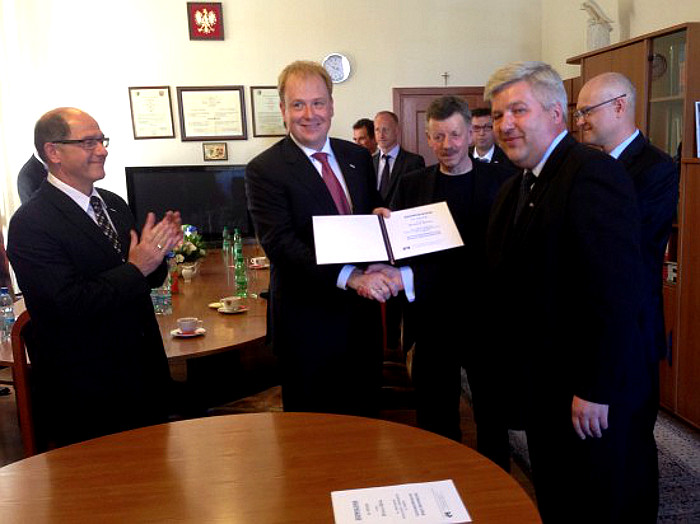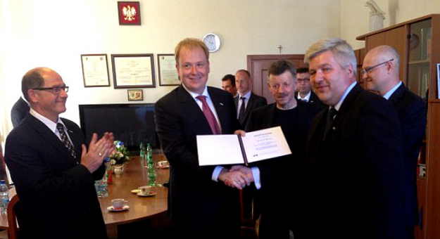 Stephan Schweiker odbiera zezwolenie od prezesa LSSE Adama Grabowieckiego. W środku Bogusław Krasucki, burmistrz Środy Śląskiej fot.: lsse