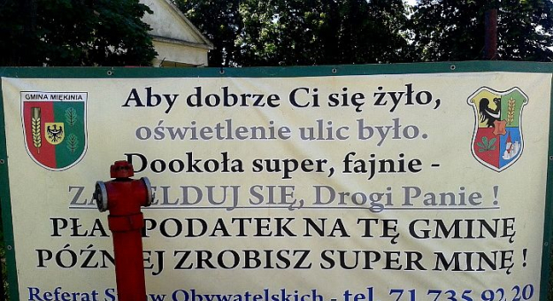 Na płocie zawisł baner namawiający mieszkańców do płacenia podatków w gminie Miękinia. – Nic o tym nie wiemy – mówią urzędnicy.