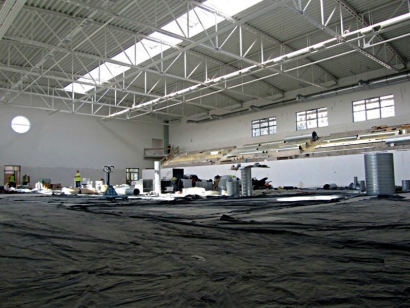 Znikają rusztowania na zewnątrz hali odsłaniając nowoczesną kubaturę obiektu. Pracę zakończył już ciężki sprzęt na placu budowy. Obecnie pracownicy montują różnego rodzaju instalacje. Już położono kable elektryczne i kanalizację.